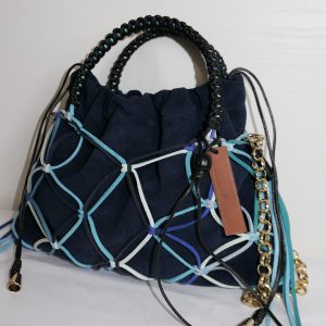 La Netbag in pelle blu marino firmata Loemya, un accessorio dallo stile unico che unisce eleganza e artigianalità. Realizzata in morbida pelle e avvolta da una rete intrecciata con cordoncini multicolor nei toni dell’azzurro e del turchese, questa borsa trasmette freschezza e personalità. I manici rigidi, rivestiti in corda intrecciata nera, assicurano resistenza e un tocco sofisticato.