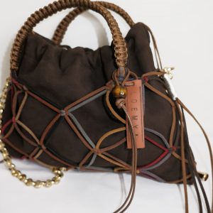La Netbag Cacao di Loemya è una borsa in pelle dallo stile sofisticato e artigianale. Il corpo in morbida pelle color cacao è avvolto da una rete intrecciata di cordoncini nei toni caldi dell’ocra, del ruggine e del grigio, che creano un raffinato motivo geometrico. I manici rigidi, rivestiti in corda intrecciata marrone, garantiscono solidità e un tocco ricercato. Dettagli preziosi come la tracolla a catena dorata, le frange sottili e i terminali metallici completano il design, rendendola una borsa versatile e chic, ideale per accompagnare look casual chic o serali con carattere.