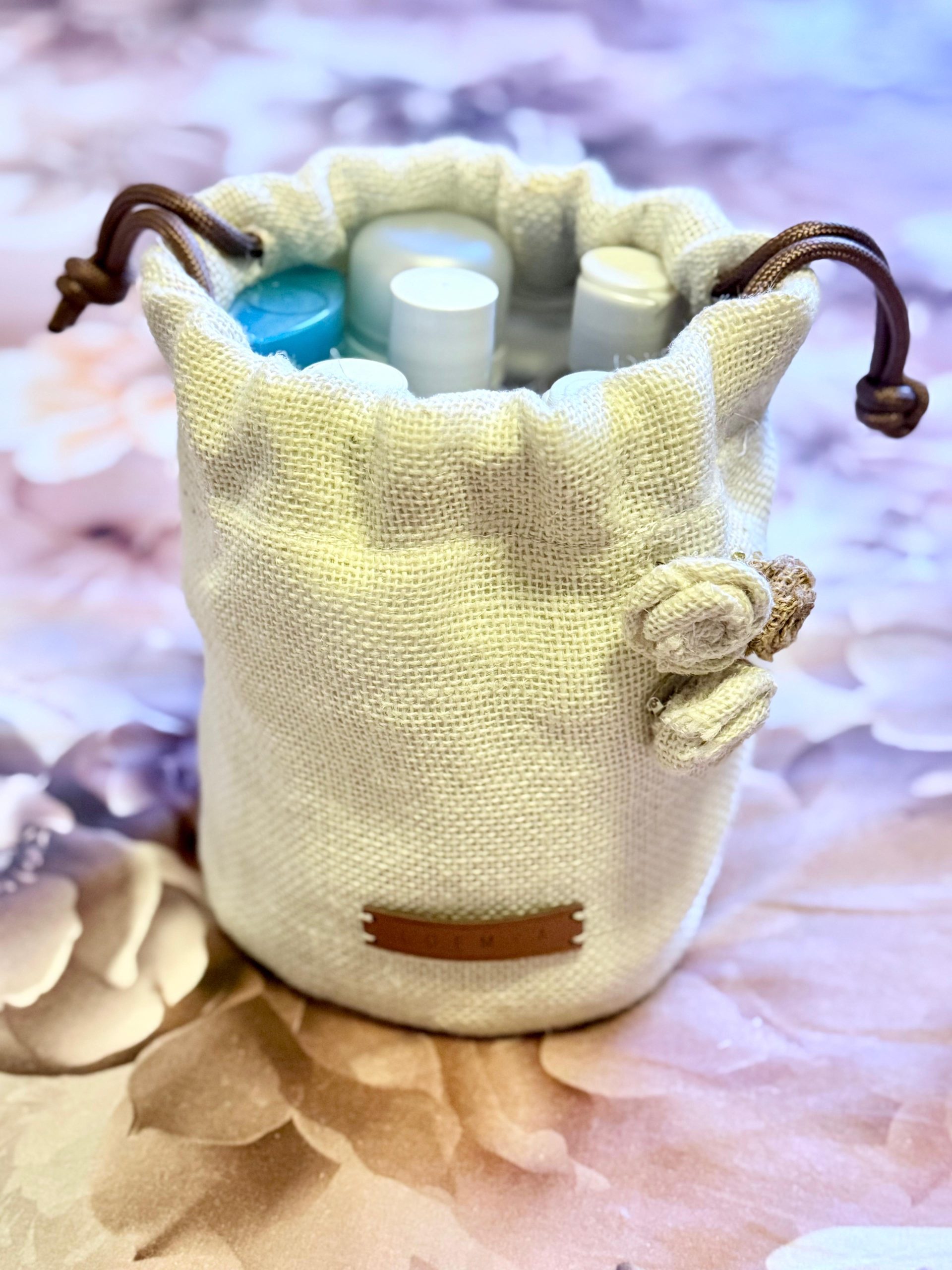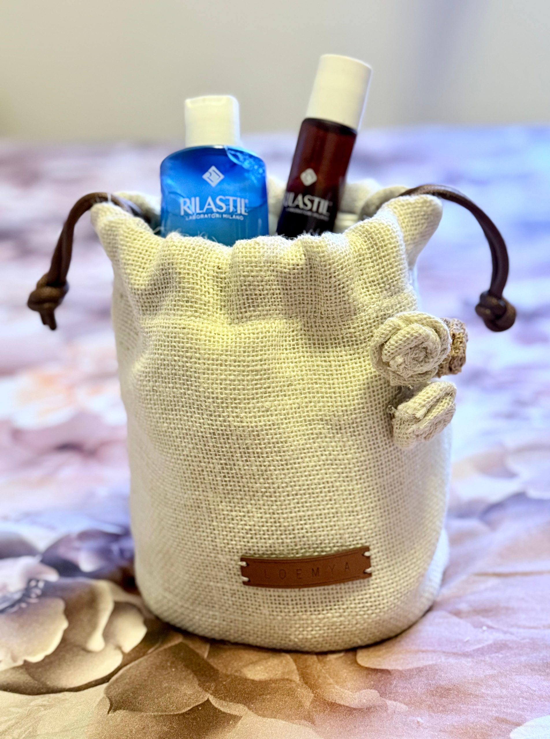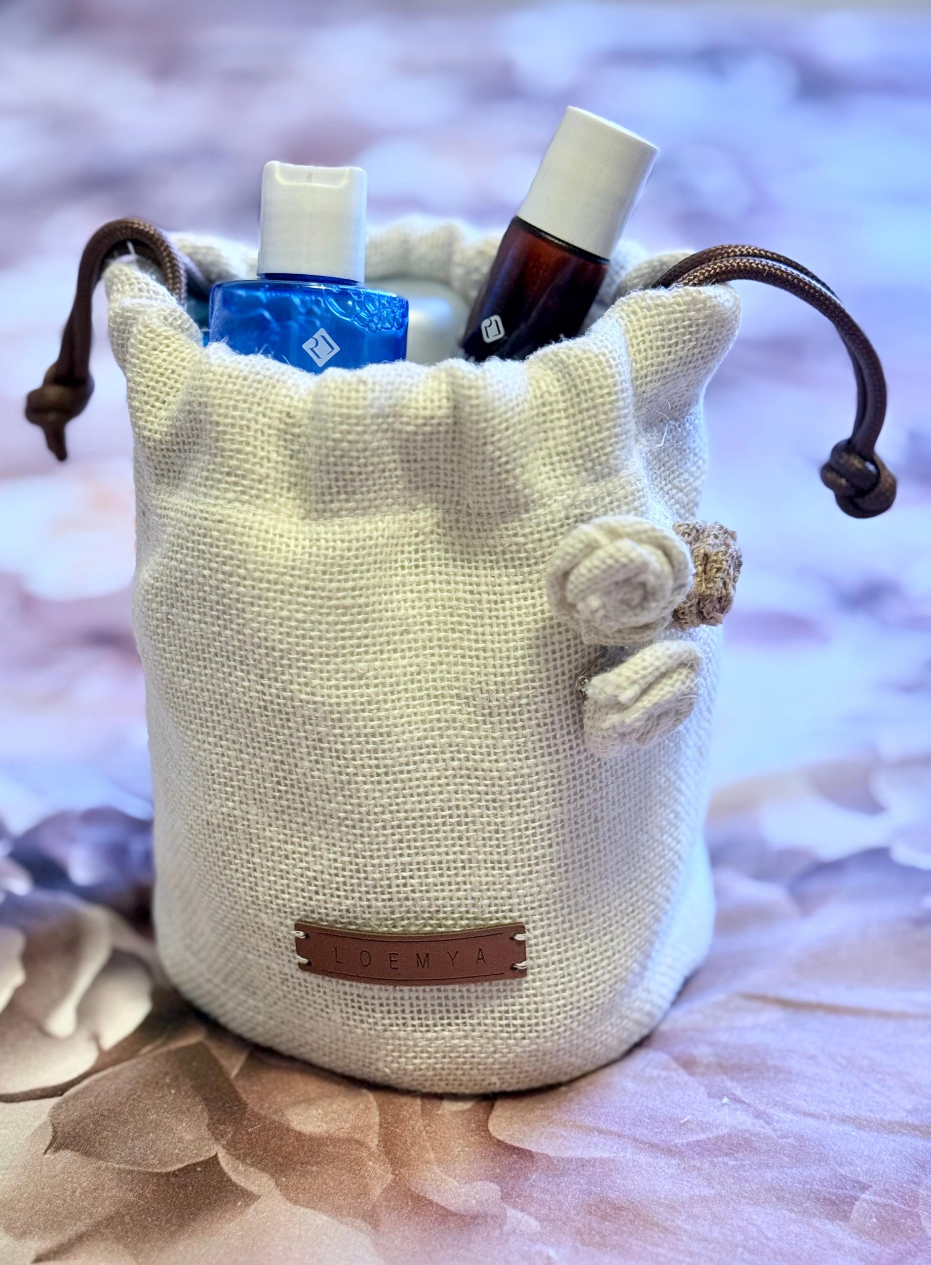 Delicata, romantica e versatile, Rosie Home di Loemya è una pouch in juta con chiusura a coulisse e dettagli floreali realizzati a mano. Il design morbido e accogliente la rende ideale come portaoggetti da casa, beauty case o elegante contenitore per cosmetici, accessori e piccoli essenziali quotidiani.